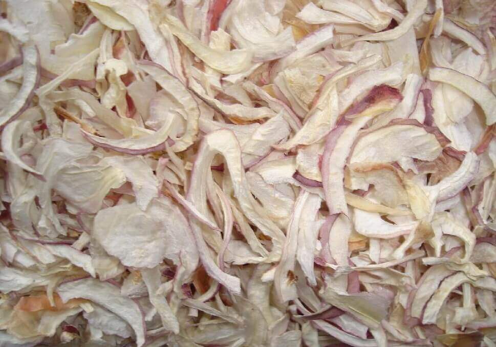 Use a centrifugal dryer to dry the onion. Spread a layer of clean gauze in the centrifuge tank, and then load the onion slices at 1300 rpm. After centrifugation for 30 seconds, take out the gauze together with the onion slices and spread. On the drying sieve, the mesh holes are generally 3mm×3mm or 5mm×5mm, and then the drying sieve is installed on the drying carriage frame. Before feeding the dryer, preheat the temperature up to 60℃, and control the drying temperature at 58~60℃ for 6~7 hours. When the moisture content drops below 5%, a single tunnel or hot air dryer 24 300~400kg dehydrated onion slices can be produced within an hour. Generally 13 to 15 tons of raw materials can produce 1 ton of dry products.