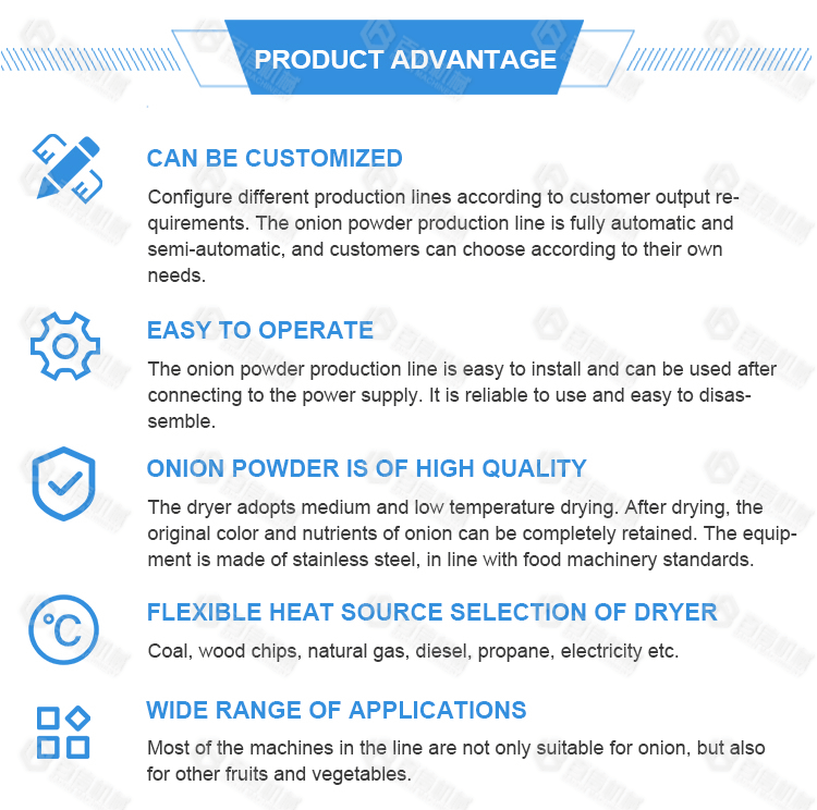 The processing line adopts advanced technology, high onion output and direct sales at factory prices. This is the best choice for onion powder business and the most ideal equipment for onion processing at present.
