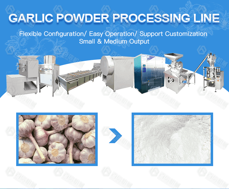 The garlic powder processing line has continuous automatic production, fast processing speed, high output and good quality. It includes garlic clove separator, garlic peeling machine, garlic washing machine, garlic slicer, air dryer, garlic dryer, garlic grinder, garlic powder packaging machine and other equipment, which can be used for deep processing of garlic dehydration slices, garlic powder, etc. . The production line adopts advanced technology, high garlic output and direct sales at factory prices. This is the best choice for garlic powder business and the most ideal equipment for garlic processing at present.