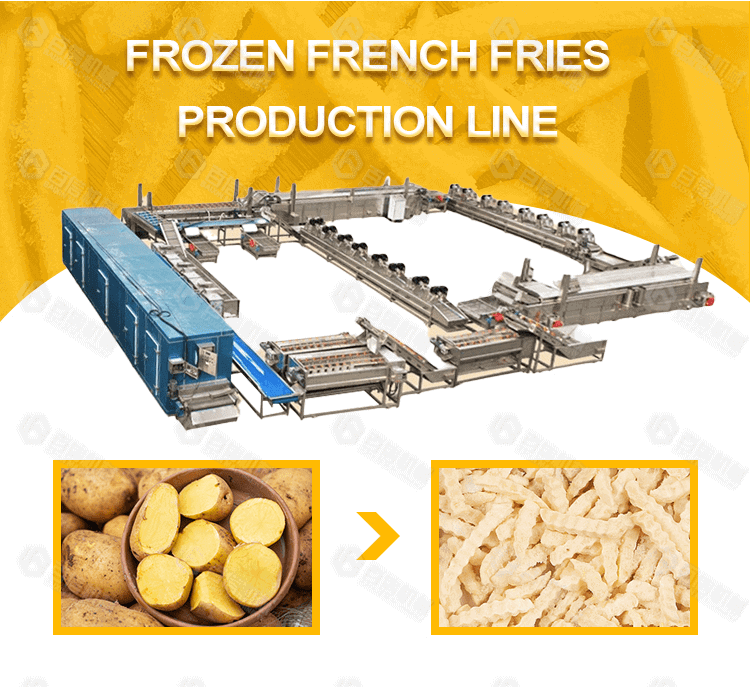 A fully automatic frozen french fries machine contains: elevating, potato washing and peeling machine, picking machine, potato cutting machine, water tank elevator,fries sorting machine, bubble washing machine, blanching machine, vibration dewatering machine,air drying machine, elevating conveyor, continuous frying machine, vibration deoiling machine, pre-cooling machine, freezing machine and automatic weighing packing machine.