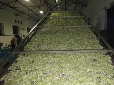 Use a centrifugal dryer to dry the onion. Spread a layer of clean gauze in the centrifuge tank, and then load the onion slices at 1300 rpm. After centrifugation for 30 seconds, take out the gauze together with the onion slices and spread. On the drying sieve, the mesh holes are generally 3mm×3mm or 5mm×5mm, and then the drying sieve is installed on the drying carriage frame. Before feeding the dryer, preheat the temperature up to 60℃, and control the drying temperature at 58~60℃ for 6~7 hours. When the moisture content drops below 5%, a single tunnel or hot air dryer 24 300~400kg dehydrated onion slices can be produced within an hour. Generally 13 to 15 tons of raw materials can produce 1 ton of dry products.