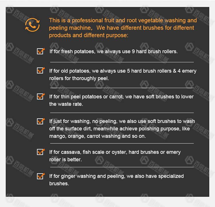 | Applicable | This machine is specially designed to wash, hair remove, soil remove, skin remove of potato, sweet potato, radish carrot, ginger, taro, peanut, mustard and other rhizome fruit and vegetables. Suitable for kitchens of school/restaurant/big factory/ food processing factory/Supermarket etc. |