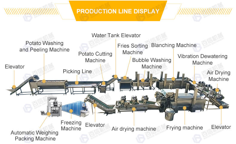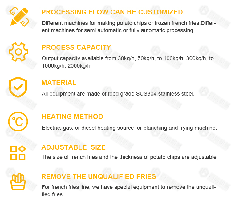 For quick frying the fries around 40 seconds in 180°oil to avoid the adhesion and extend the shelf life |