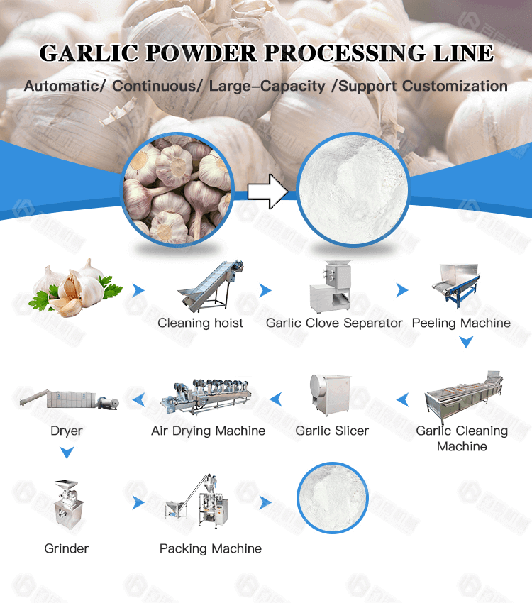 The garlic powder processing line has continuous automatic production, fast processing speed, high output and good quality. It includes garlic clove separator, garlic peeling machine, garlic washing machine, garlic slicer, air dryer, garlic dryer, garlic grinder, garlic powder packaging machine and other equipment, which can be used for deep processing of garlic dehydration slices, garlic powder, etc. . The production line adopts advanced technology, high garlic output and direct sales at factory prices. This is the best choice for garlic powder business and the most ideal equipment for garlic processing at present.