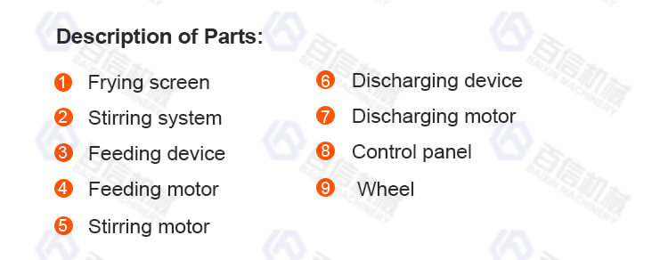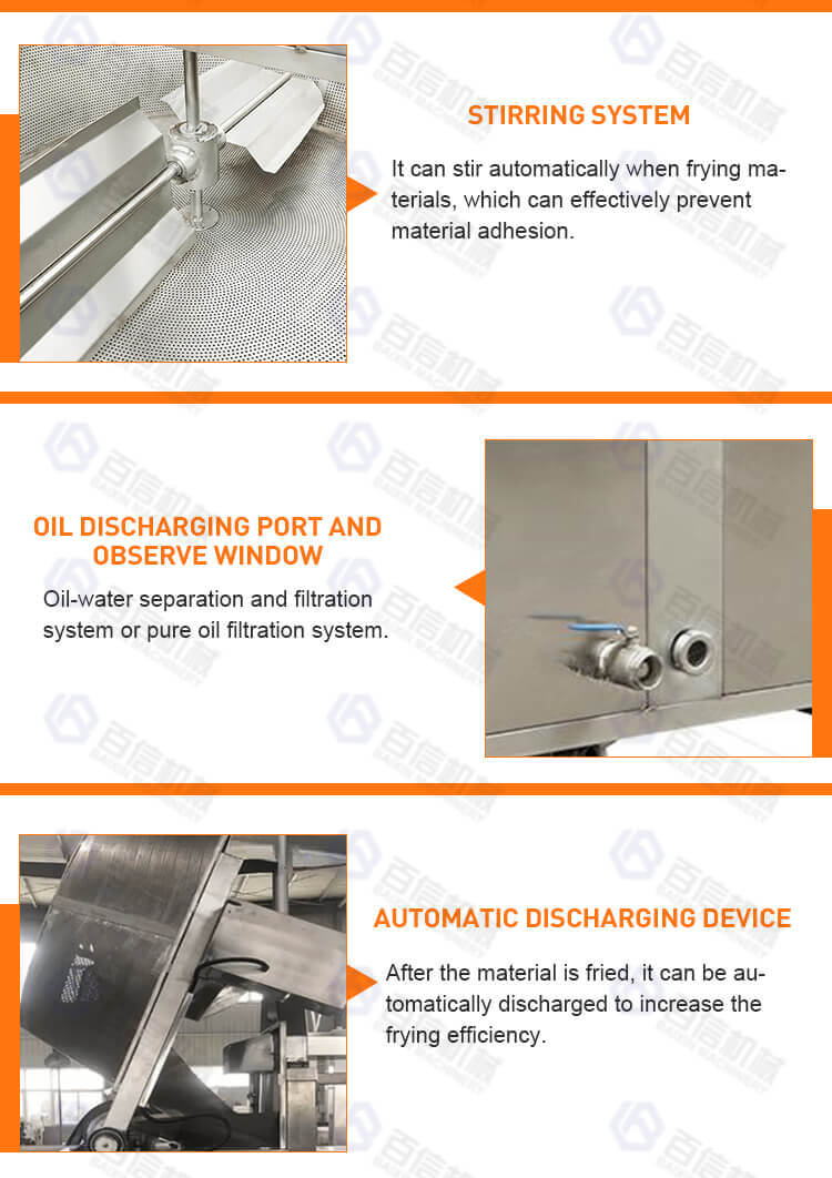 | Core advantages | Suitable for different foods/Frying time and temperature adjustable/ Can be customized/ Gas/LPG/diesel/electricity heating |